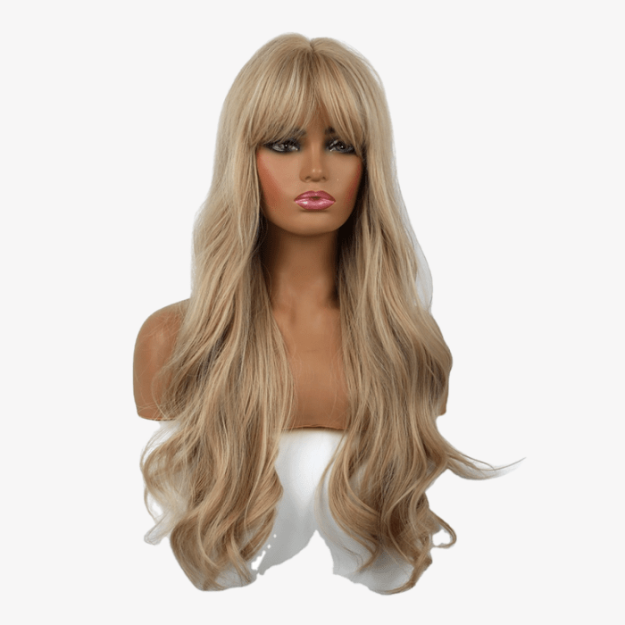 Parochňa zo syntetických kučeravých vlasov 70 cm dlhá . Krásna svetlá blond parochňa, mierne kučeravé, husté vlasy. Konce sú rovnomerne zastrihnuté, vlasy nie sú zatienené.